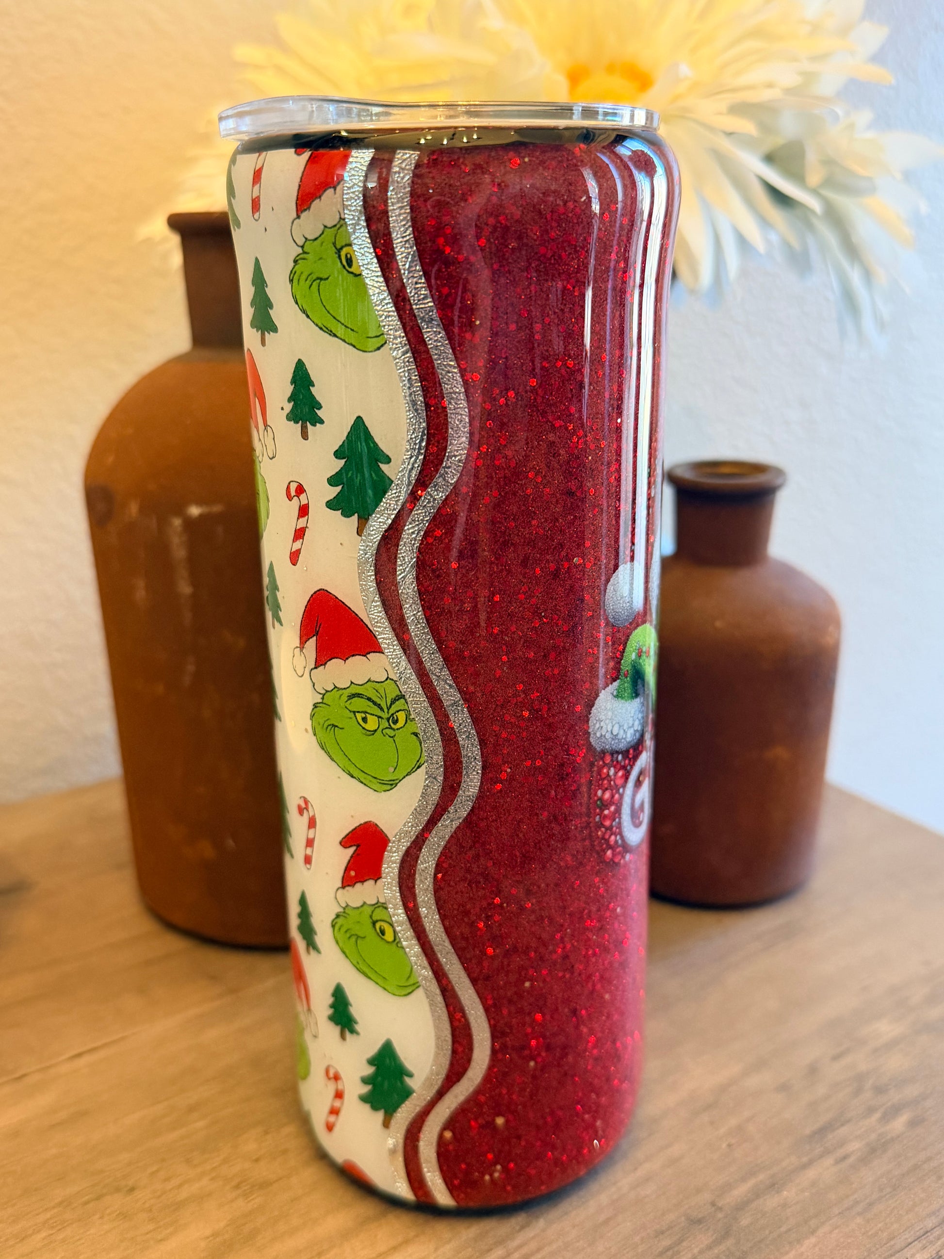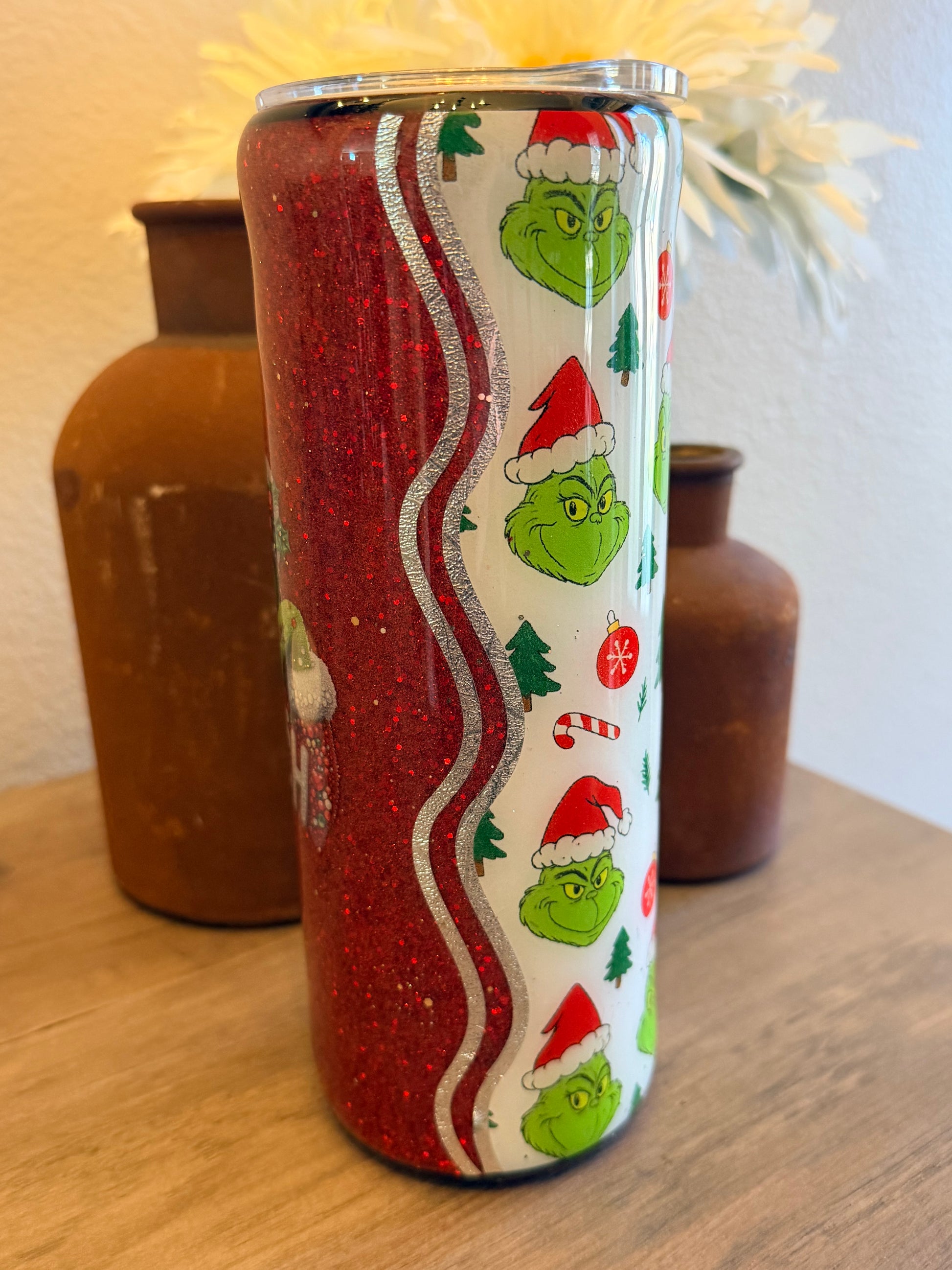 This holiday tumbler is for the true Green Guy fans — the ones who love a little sass with their Christmas cheer! Featuring a bold red glitter base and a full wrap of adorable Green faces, candy canes, ornaments, and Christmas trees, this tumbler brings all the festive vibes with a sprinkle of attitude. 😏✨