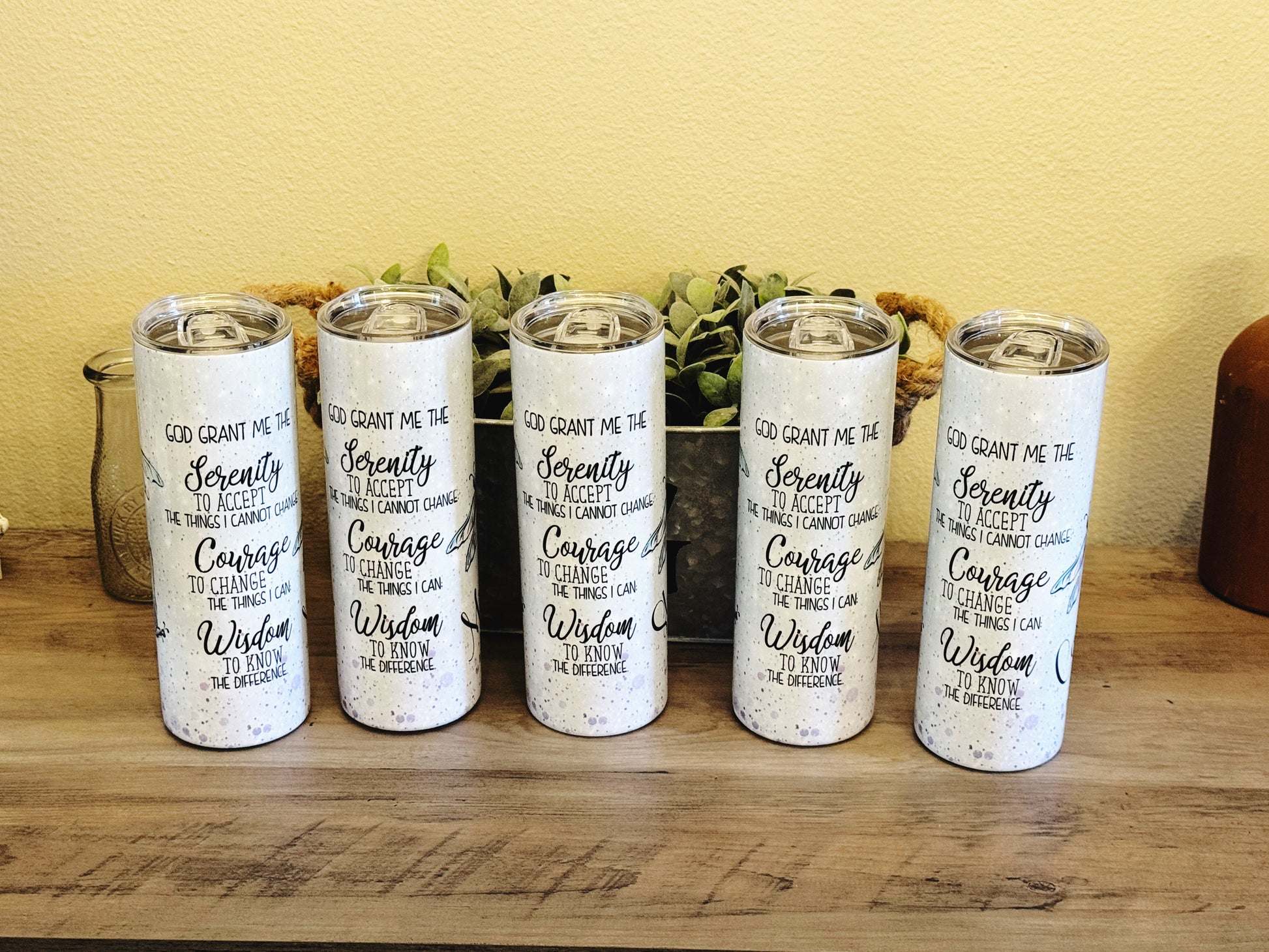 Each tumbler features the Serenity Prayer on one side and elegant dragonflies in soft pastel tones on the other — symbolizing hope, transformation, and grace. Perfect for gifting, reflection, or simply sipping in peace.